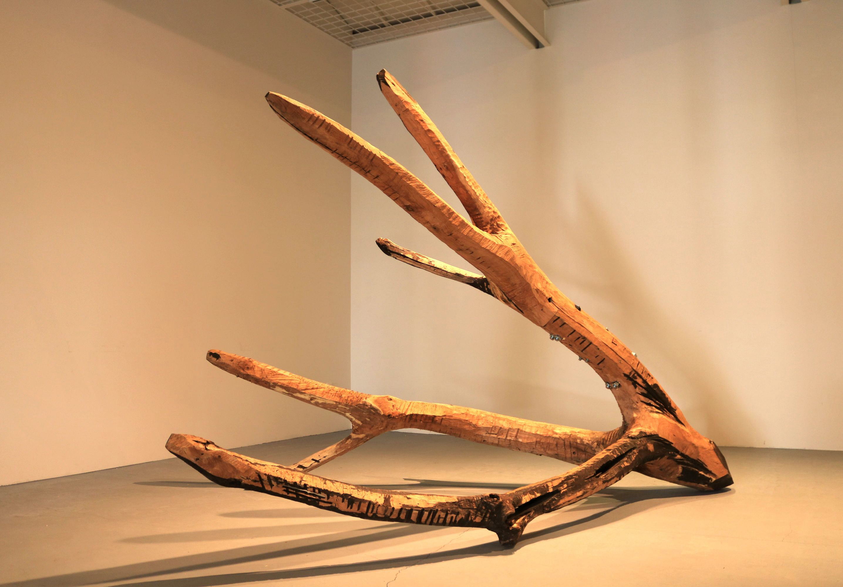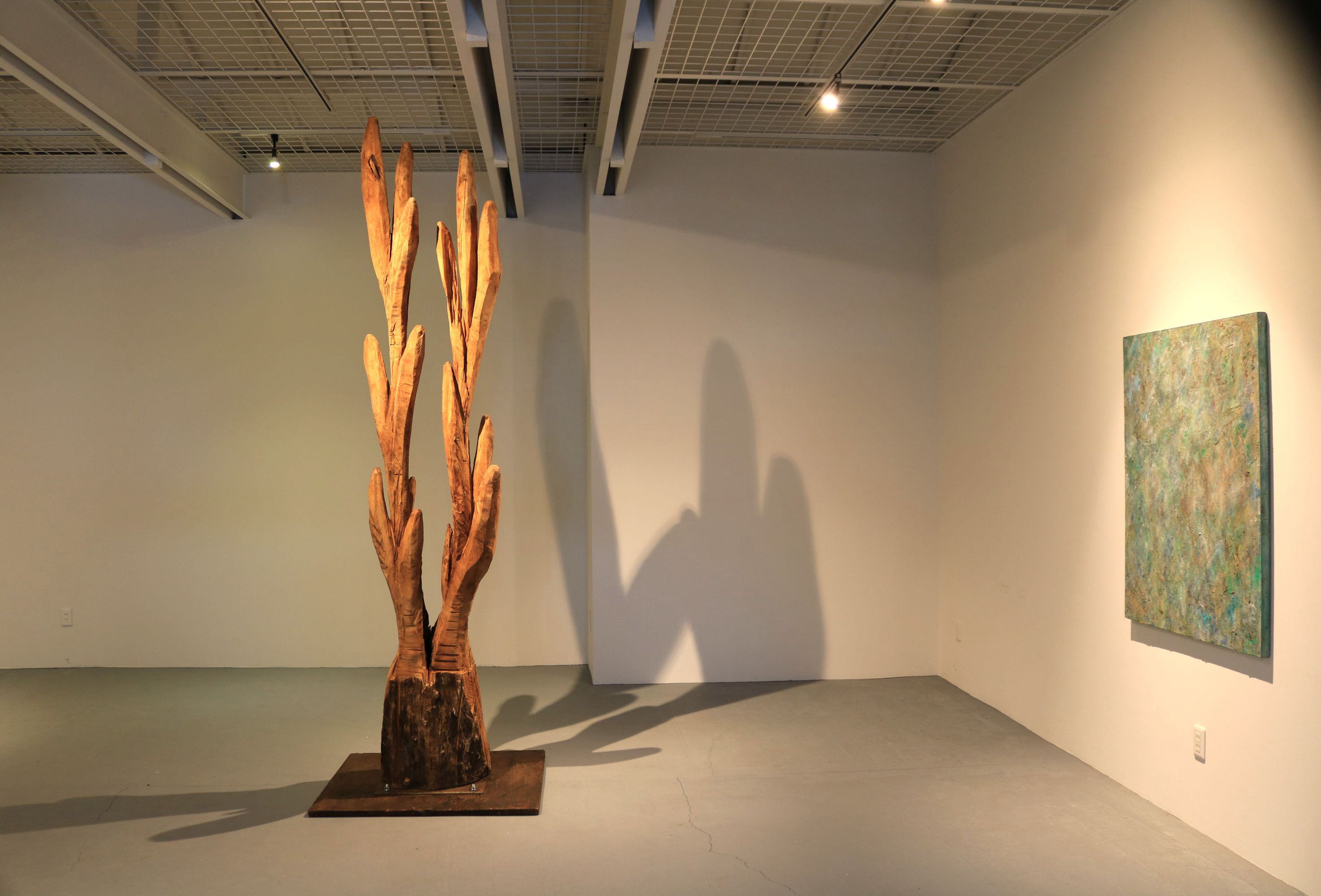 左:「殖 #1」(ハリエンジュ H290㎝ 右:「森の気」 オイルスティック F50